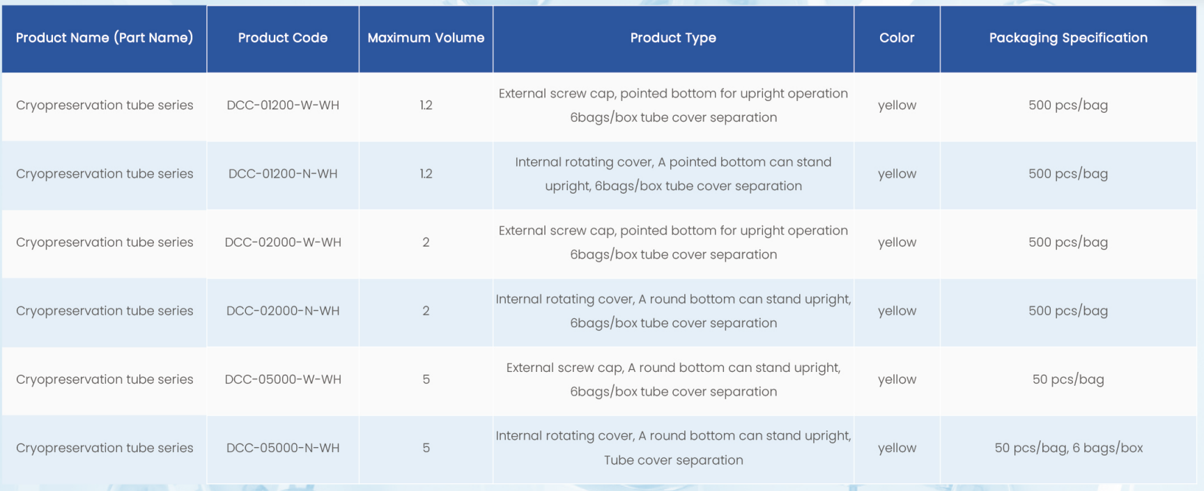 Cryogenic vials are available in different volumes and configurations and are compatible with standard freezing equipment,cryogenic storage systems and laboratory handing tools. Their standardized dimensions and construction support securesample containment and reliable performance during freezing, thawing, and routine laboratory handling.